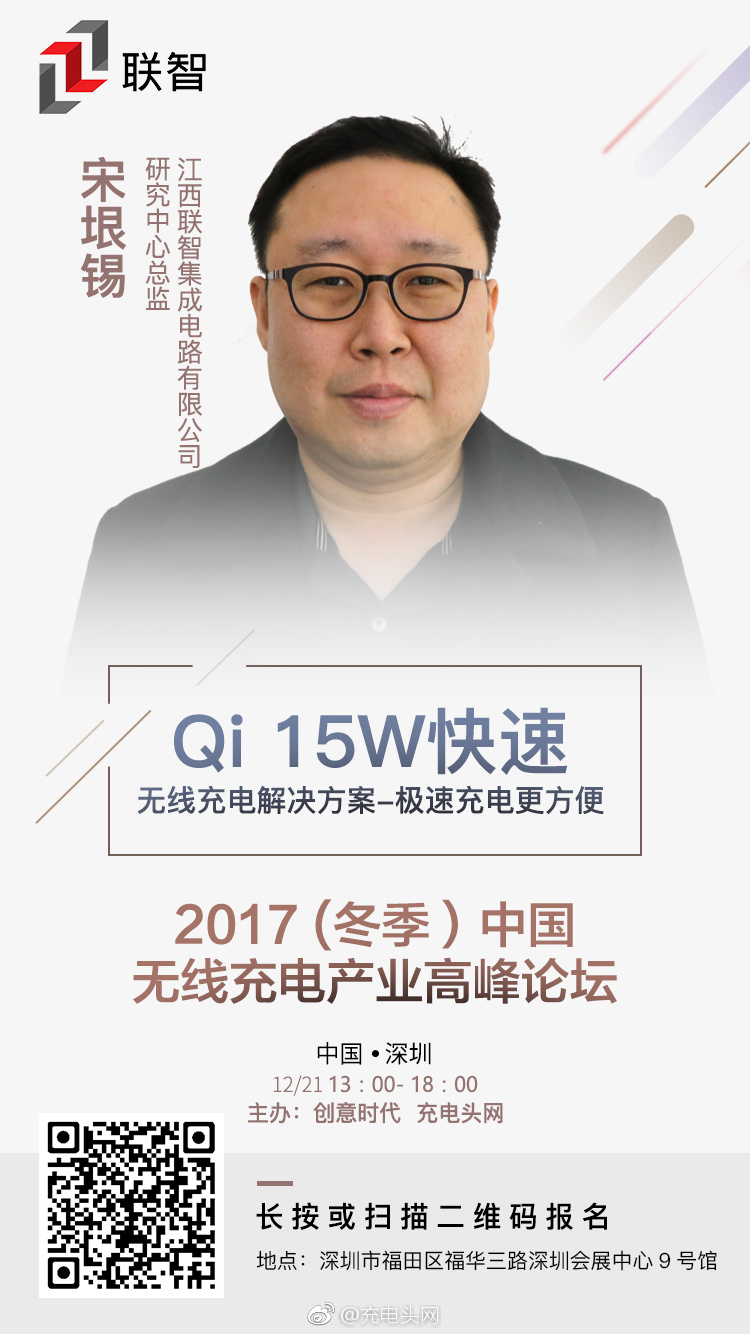 该芯片是联智技术团队在宋垠锡博士的带领下成功研发的,宋垠锡,韩国首尔大学博士,江西联智集成电路有限公司研究中心总监。联智将在《2017(冬季)中国无线充电产业高峰论坛》上发布这款芯片,该论坛将于12月21日在深圳会展中心举行,由充电头网、创意时代联合主办。此次高峰论坛宋博士将为大家带来主题演讲《Qi 15W快速无线充电解决方案-极速充电更方便》,届时大家将能了解关于这款芯片的更多信息,相信也能收获更多关于最新无线充电技术的干货知识。